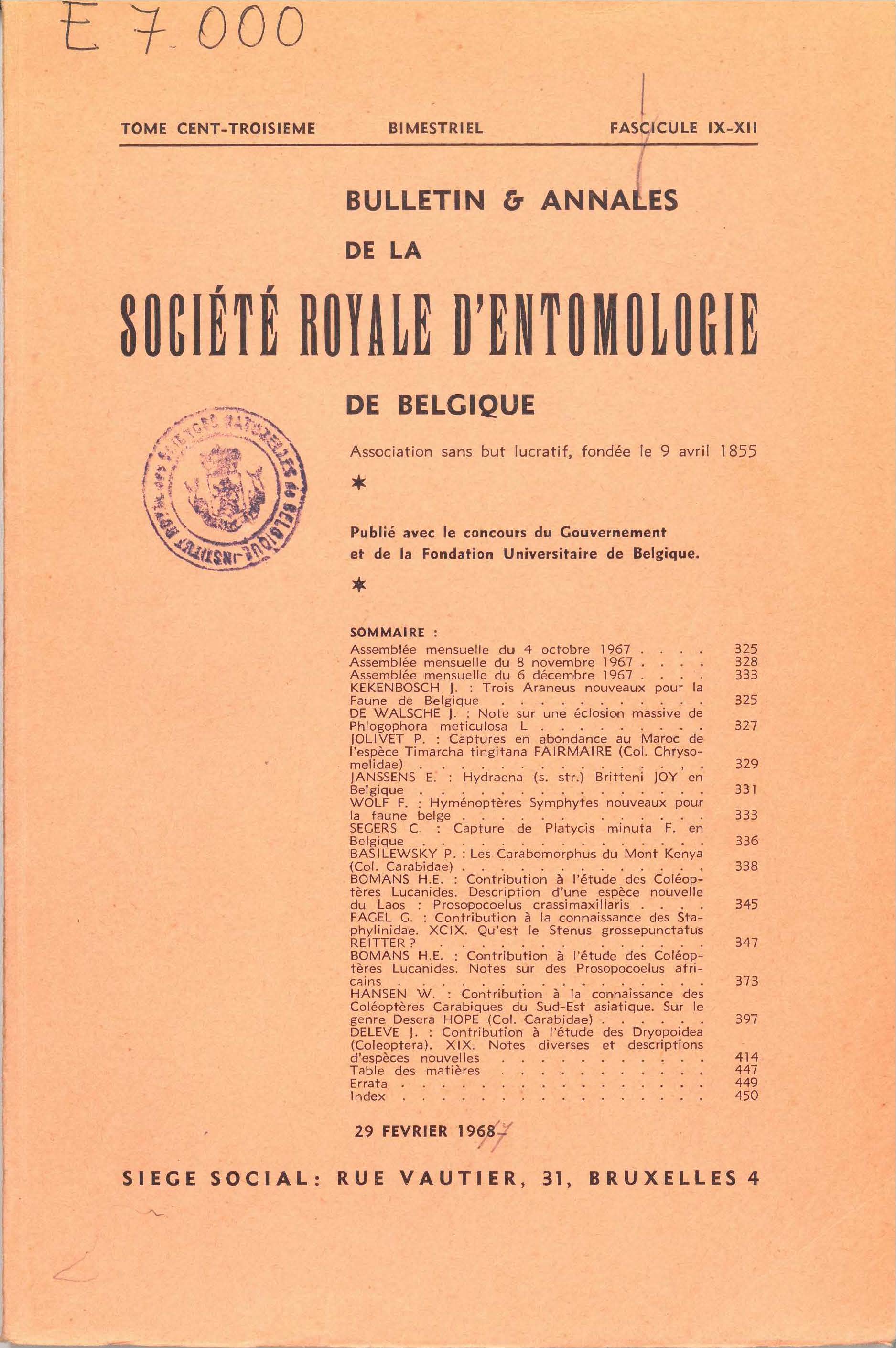Société royale belge d'Entomologie - Koninklijke Belgische Vereniging voor Entomologie
