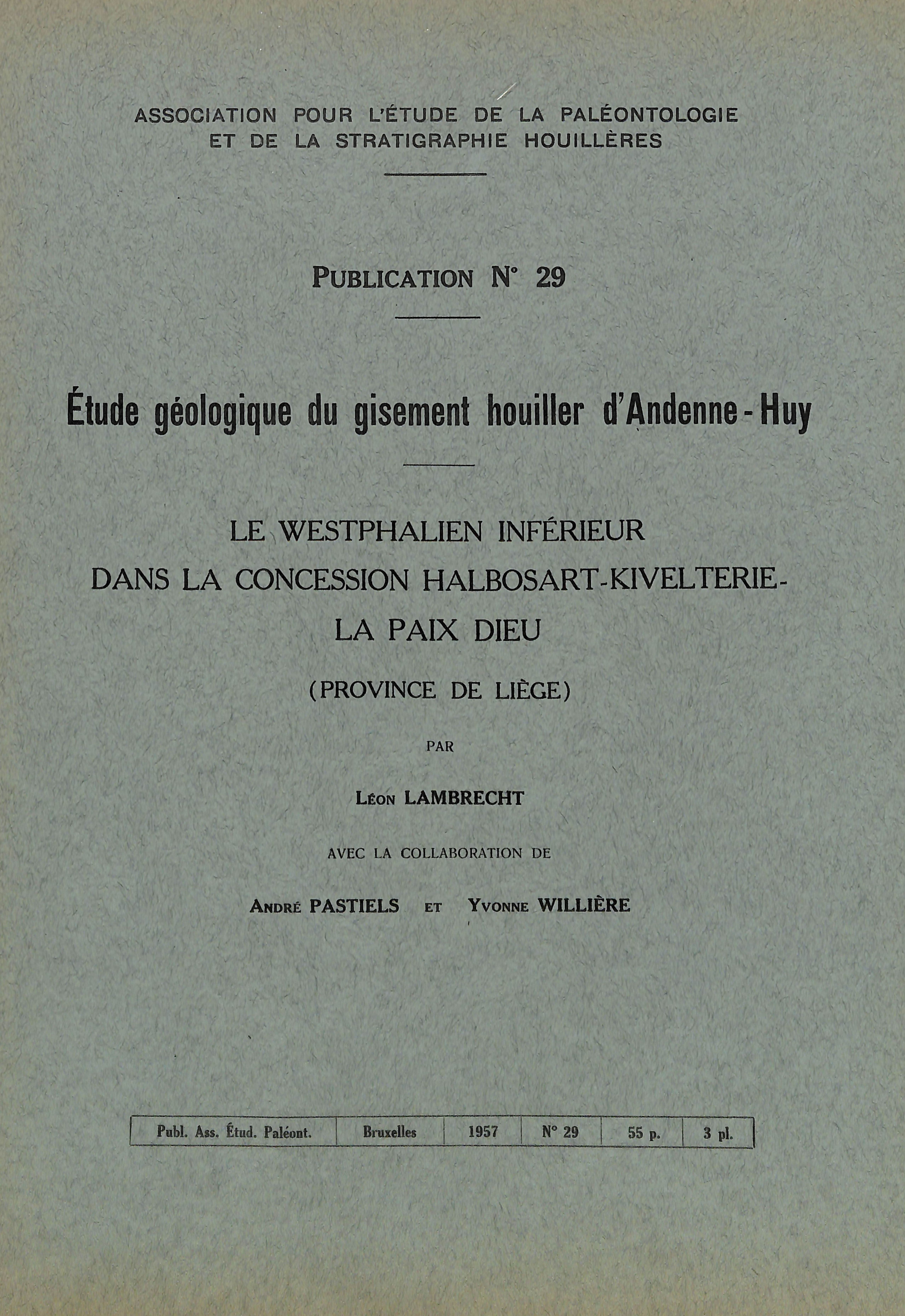 1957 N°29 - Etude géologique du gisement houiller d'Andenne-Huy - Le Westphalien inférieur dans la concession Halbosart-Kivelterie-La Paix Dieu (Province de Liège)