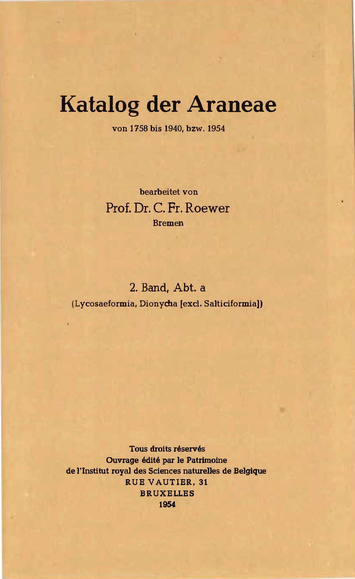 Voorpag Katalog der Araneae von 1758bis 1940 bzw 1954 Dr. C. Fr. Roewer 2 Band Abt a (Lycosaeformia, Dionycha (exl. Salticiformia)) 1954.jpg