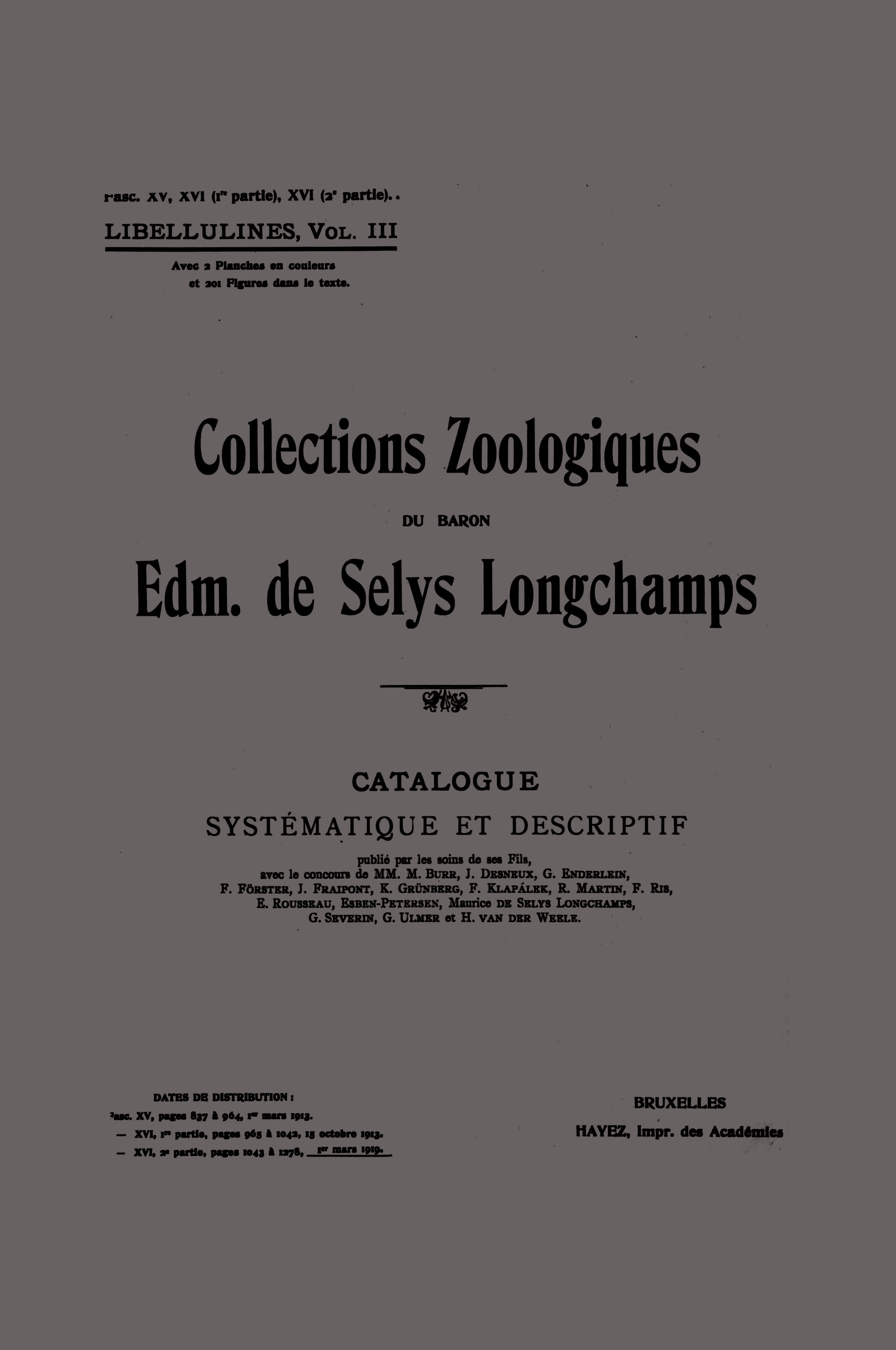 Systematic and Descriptive of Zoological Collections catalog of the Baron Edmond Selys Longchamps