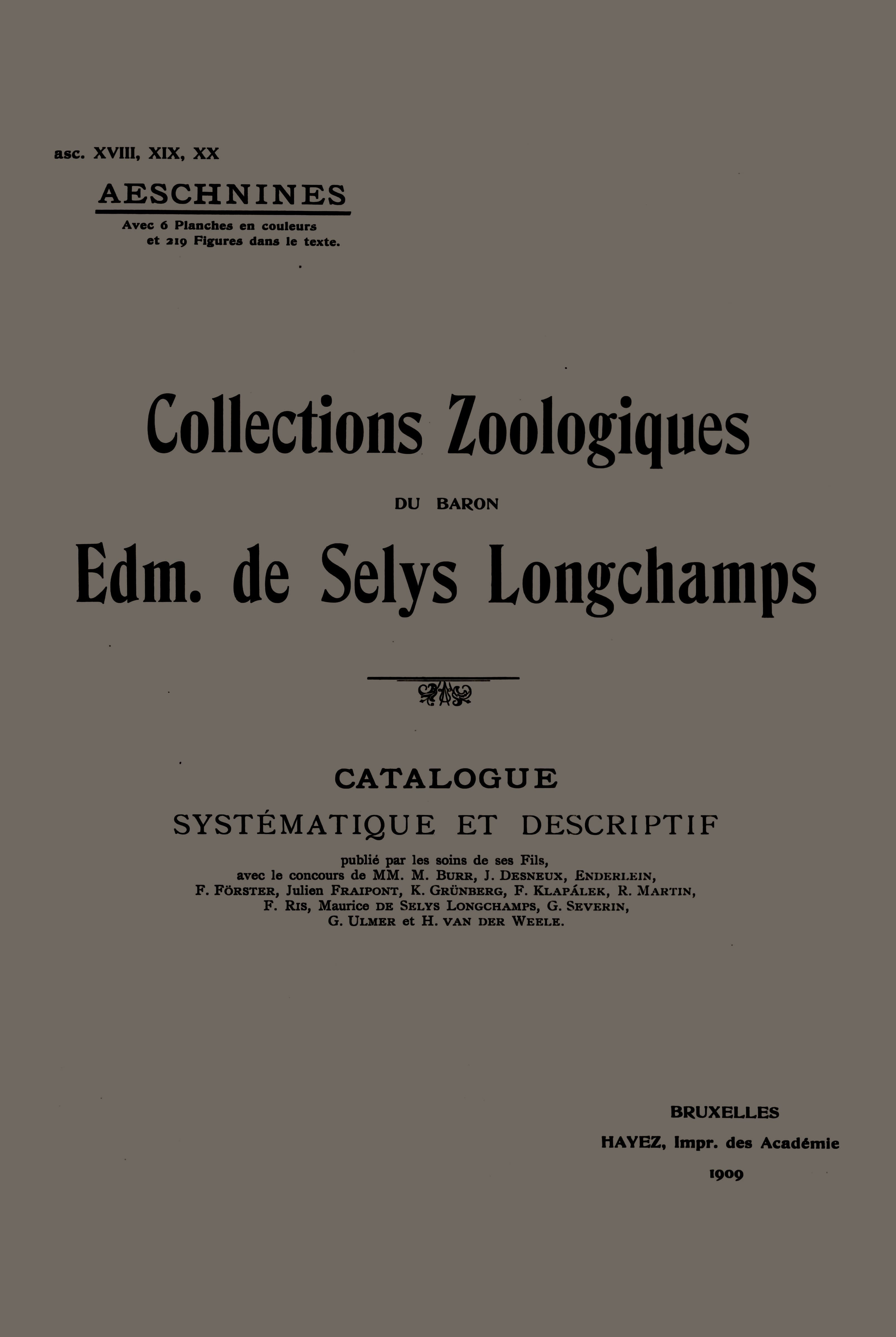 Systematic and Descriptive of Zoological Collections catalog of the Baron Edmond Selys Longchamps