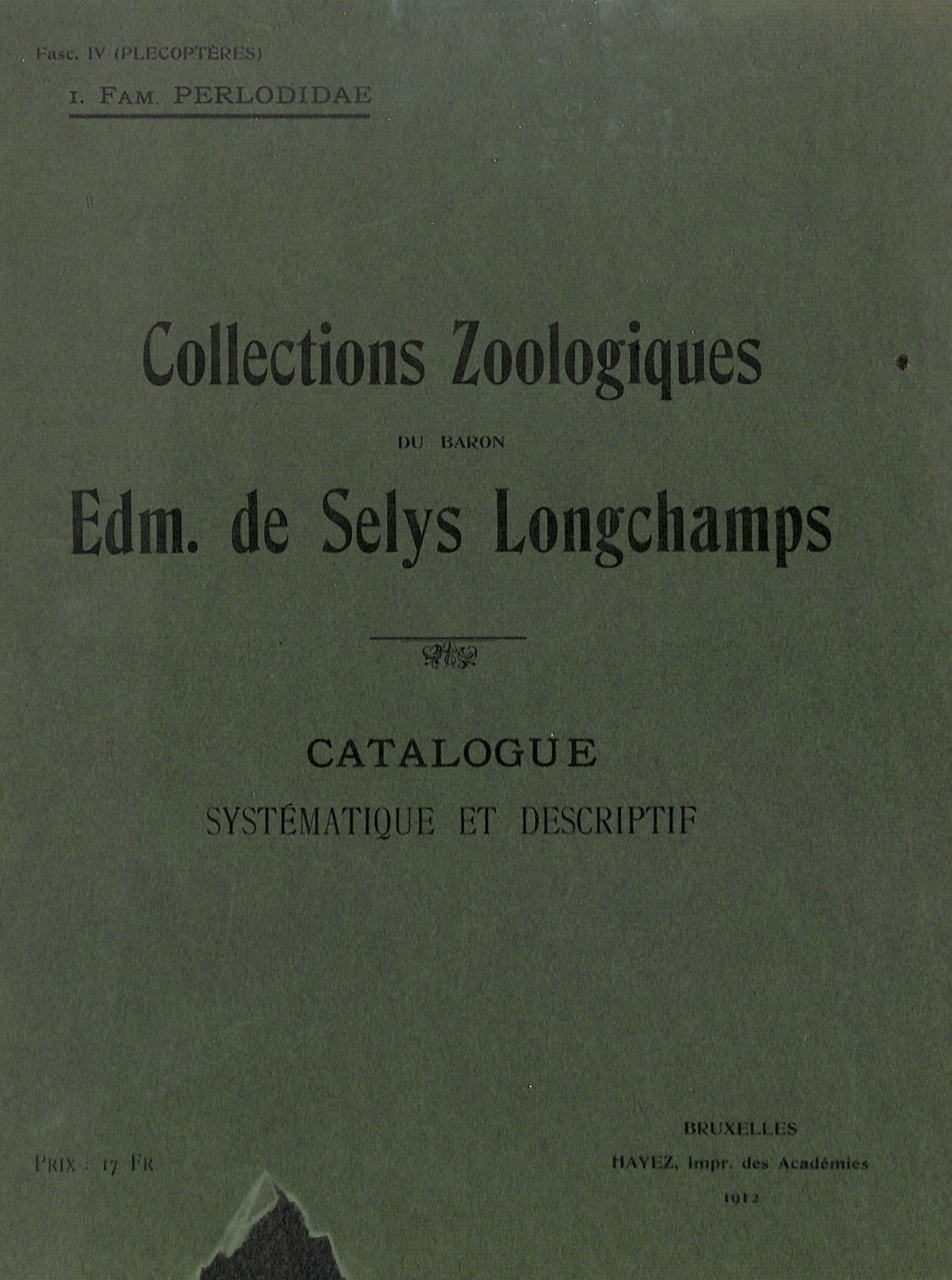 Systematic and Descriptive of Zoological Collections catalog of the Baron Edmond Selys Longchamps