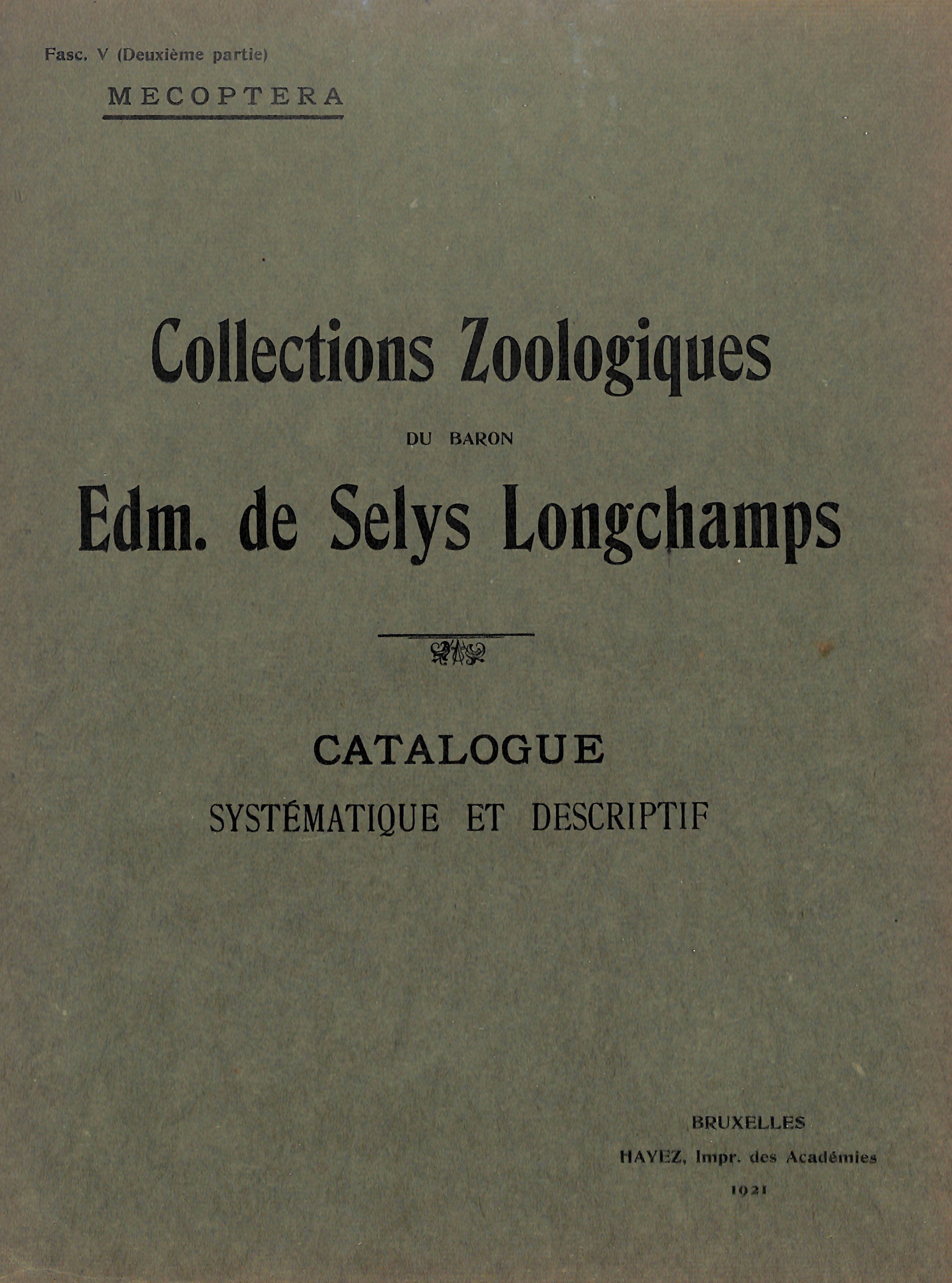 Systematic and Descriptive of Zoological Collections catalog of the Baron Edmond Selys Longchamps