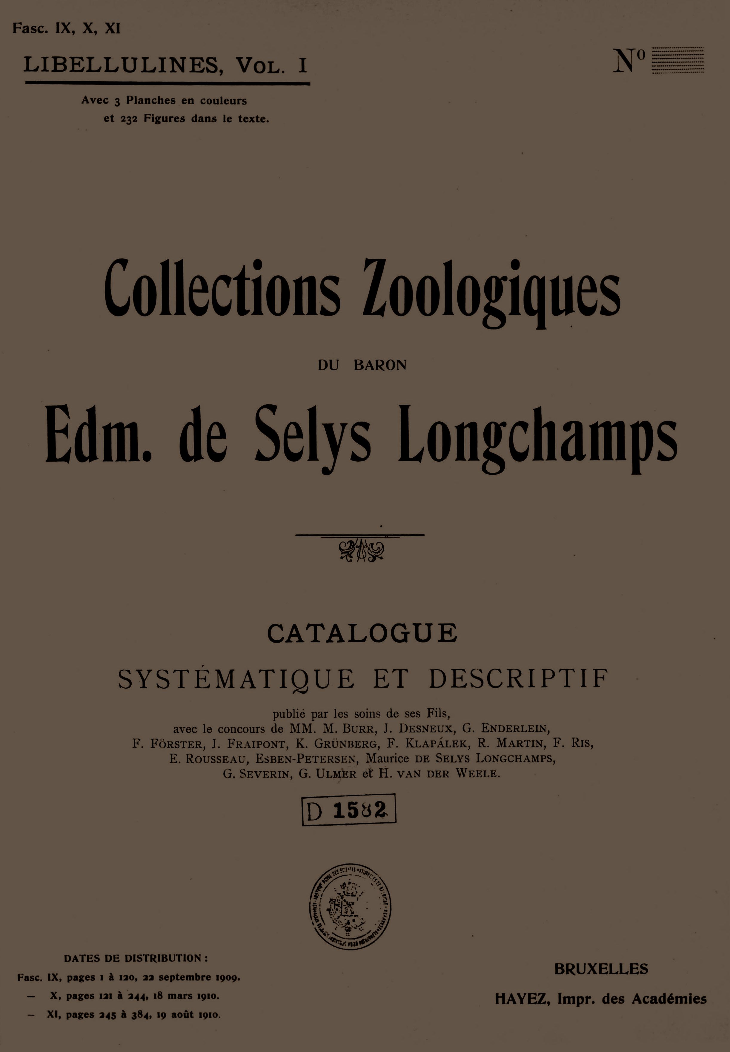 Systematic and Descriptive of Zoological Collections catalog of the Baron Edmond Selys Longchamps