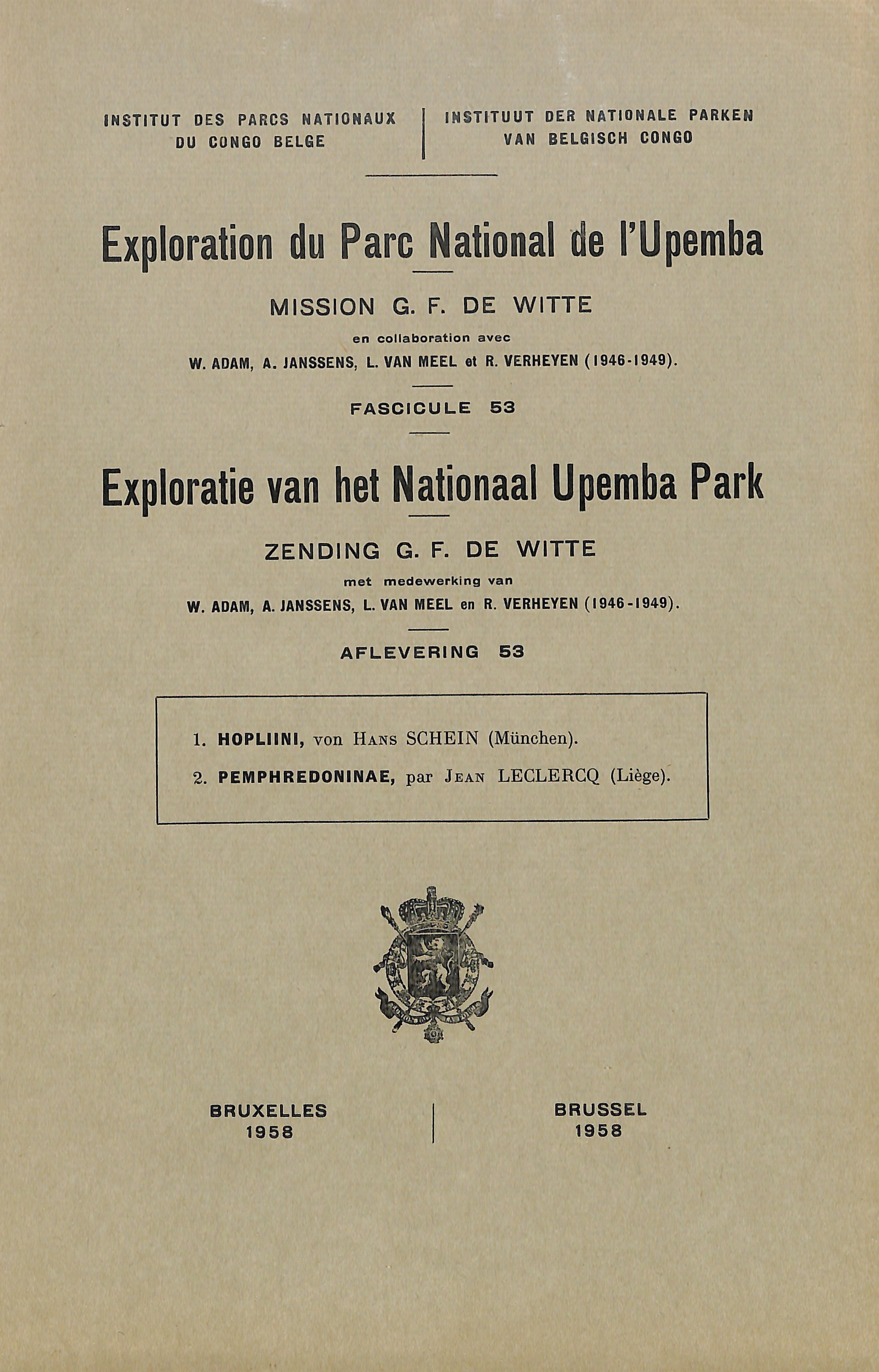 Exploration du Parc National de l'Upemba - Exploratie van het Nationaal Upemba Park (1946-1949) Mission / Zending F. G. de Witte