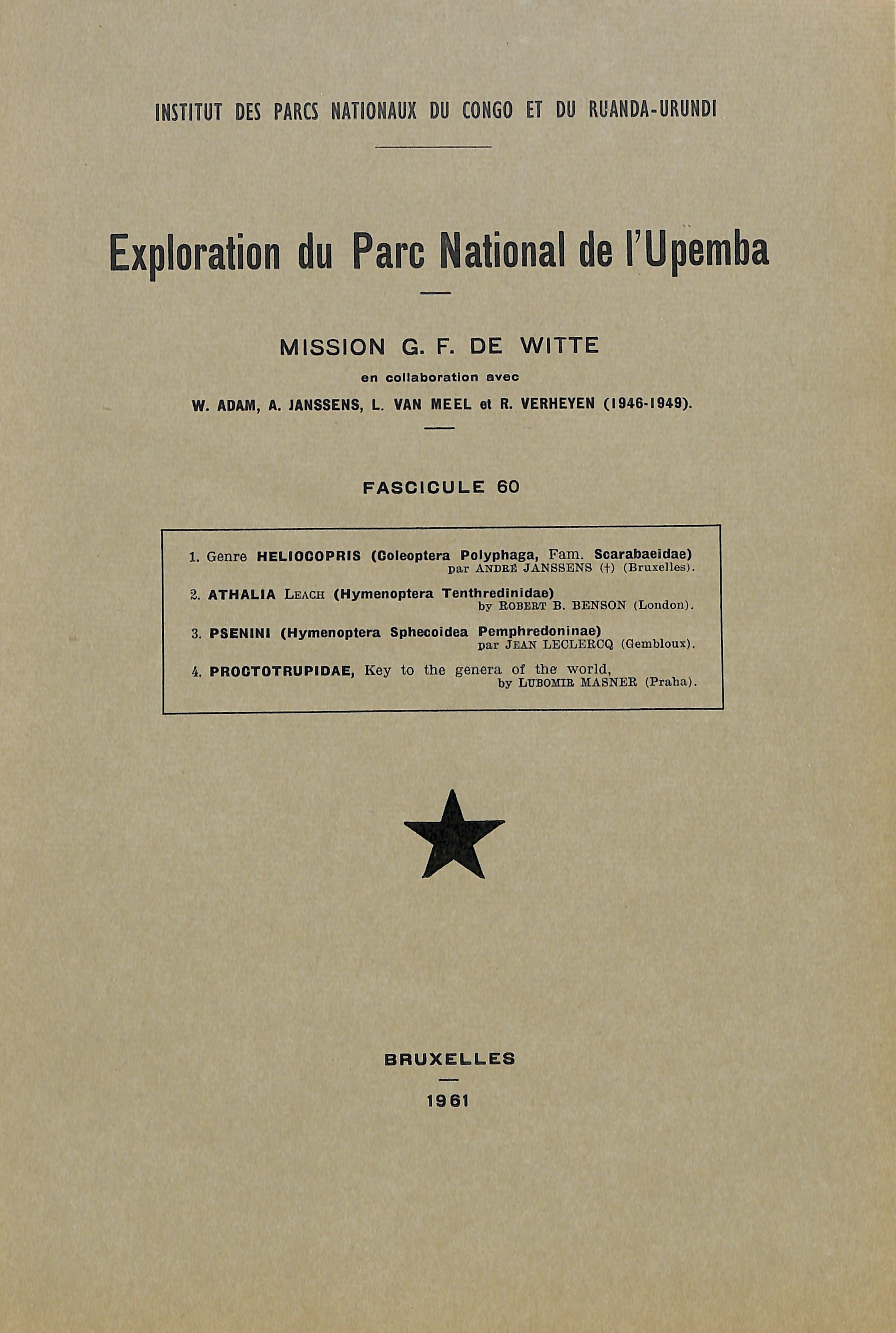 60-1961 - Mission/Zending G.F. de Witte - Heliocopris (Coleoptera Polyphaga, fam. Scarabaeidae), Athalia (Hymenoptera Tenthredinidae), Psenini (Hymenoptera Sphecoidea Pemphredoninae), Proctotrupidae
