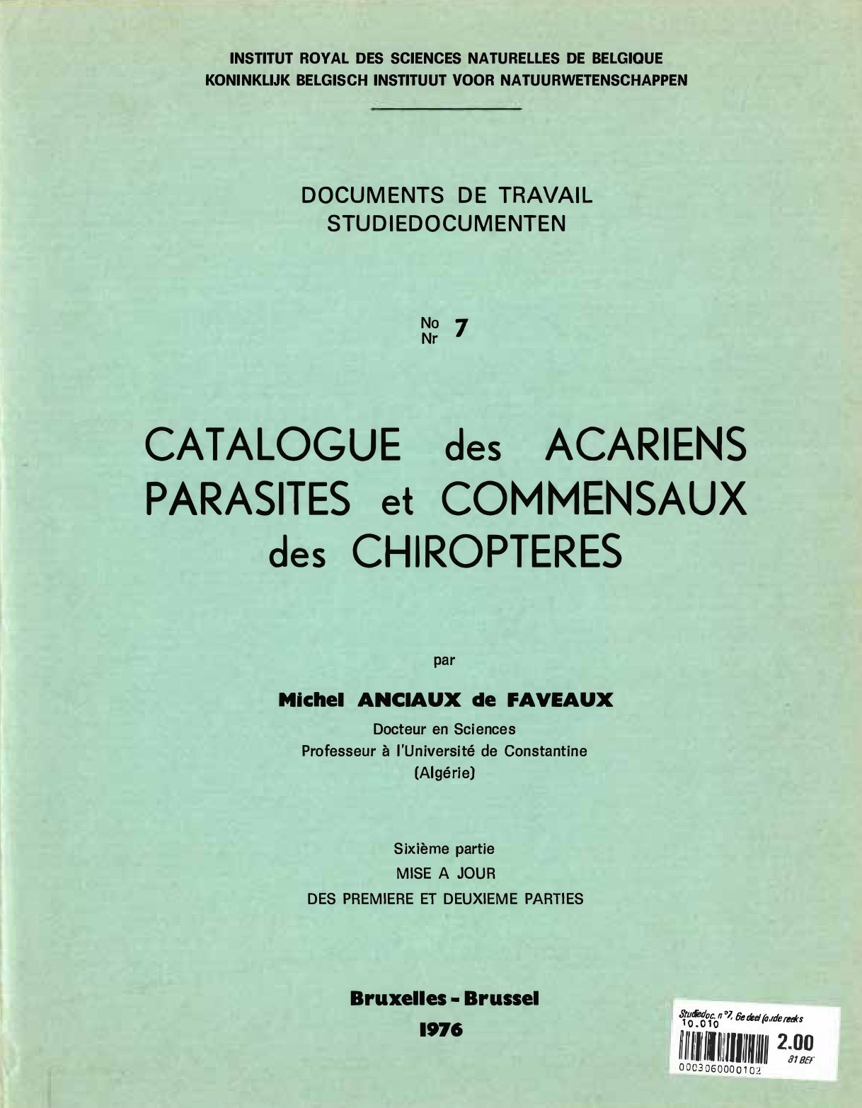 7-1976 - Catalogue des acariens parasites et commensaux des chiroptères. Sixième partie: Mise à jour des première et deuxième parties